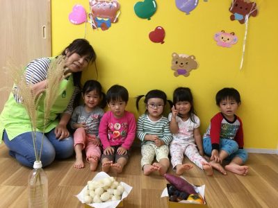 皆様も見えましたか❓ 藤が丘園ではお供えのお月見団子作りにチャレンジ❕❕ 一生懸命こねて・・・ まーるくまーるく◎ ピラミッドのように一人ひとりそーっと積み上げて完成★ 先生たちの十五夜のお話のペープサート