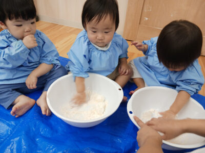 お兄さんお姉さんたちと一緒に活動をしました🎵 まず小麦粉に触れてみて、そのあと氷をれて少しずつ溶けていきネバネバした感触になった小麦粉を恐る恐る触ったりしていました。 最後には慣れた様子で思う存分に楽しんでいました😊 11月にある生活発表会に向けて少しづつ準備をし ...