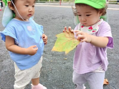 散策を楽しんでいます🎶 大きな葉っぱを発見🍁! お手手繋ぎもお上手ですね😌 れもん組さんの成長がとても嬉しいです🎵
