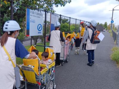 しっかりつかまってお外遊びへ出発! ドキドキしながらも新しい刺激や、見える景色を楽しんでいますよ👏