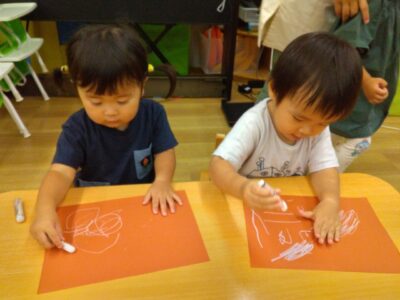 白いクレヨンでカキカキ…🖍️ お友だち仲良くグルグルと自由に描いています🎨 何を描こうかなー?真剣な表情も可愛いですね…🫠♥️小さくて ...