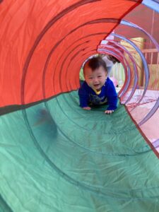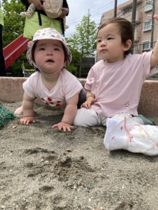 今までは柔らかい床の上で遊ぶことが多かったのですが、お砂場遊びデビューをしました!
