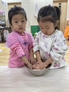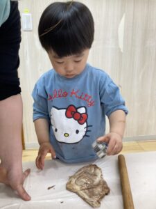 あらかじめ、先生が用意した生地にココアパウダーを混ぜて、コネコネ💕