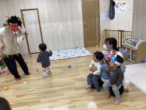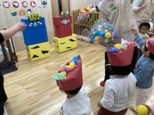 びっくりして保育者に助けを求めるお友だちや、動じずにボールを投げ続けるお友だちがいたりと、みんなそれぞれ頑張りましたよ👏❣️