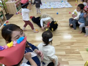 突然の鬼の登場にびっくりして逃げつつも、一生懸命ボールを投げて鬼退治する子どもたち✨勇敢でした✨