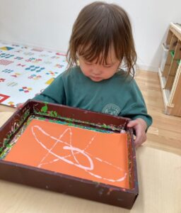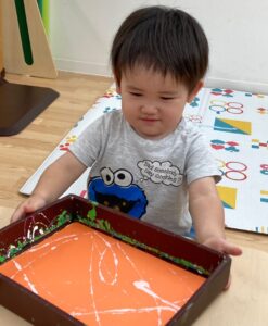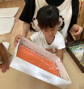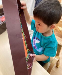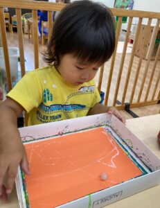 箱を器用に使って、画用紙の上でビー玉ころころ✨