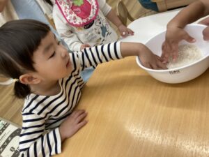 実際のお米を触ったり、おにぎりの製作をしたり、食について楽しみながら興味を持つことができました😉