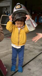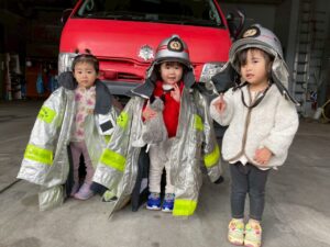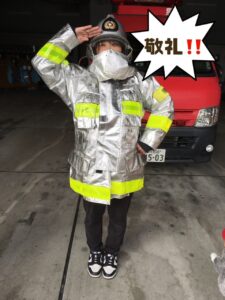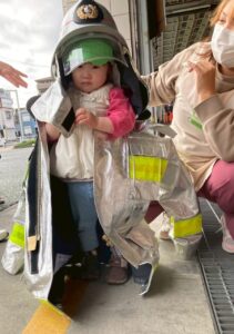 ぶどう組さん防火服を着せてもらいパチリ📸✨