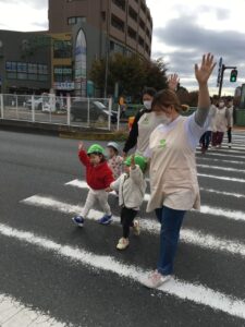 横断歩道をしっかり手をあげて渡るぶどう組さん、さすがです✨✨