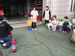 お話をしっかり聞いた後は、いよいよ消防車の近くへ行き見学のスタートです‼️
