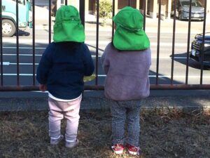 シャボン玉に飽きたら、公園の柵越しに仲良く大通りの車を眺めています💞
