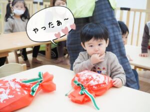 サンタさんにびっくりして泣いちゃったおともだちも、立ち上がって積極的にプレゼントを受け取ることができました😆💯