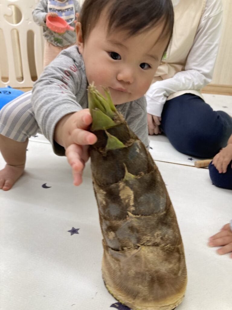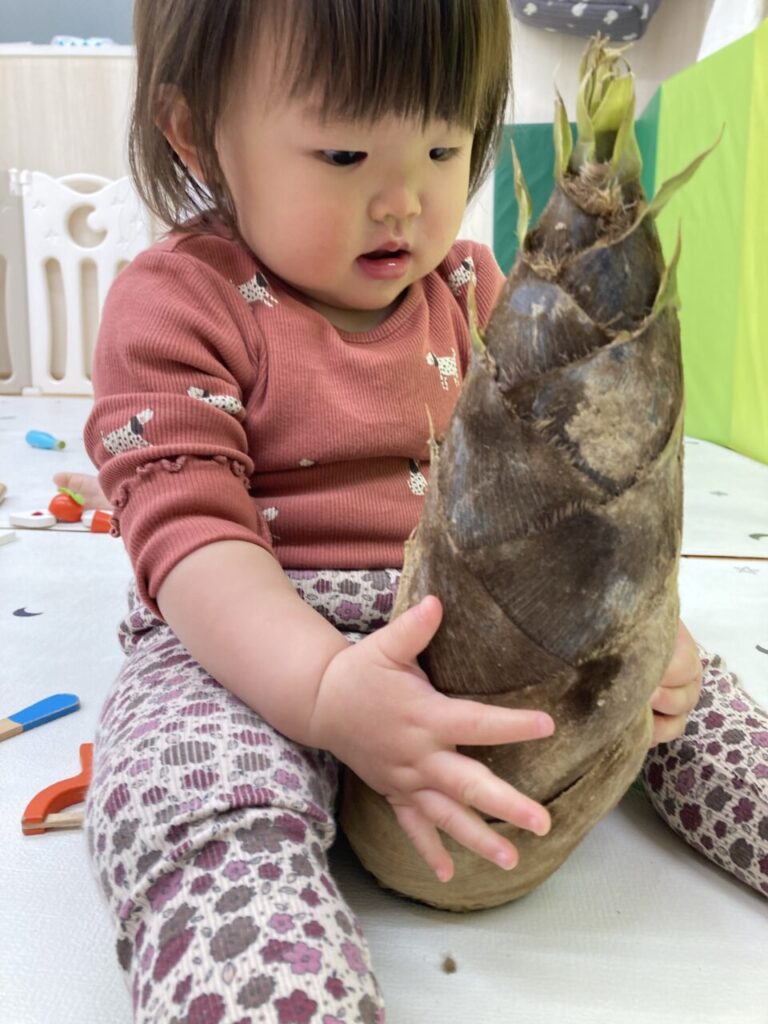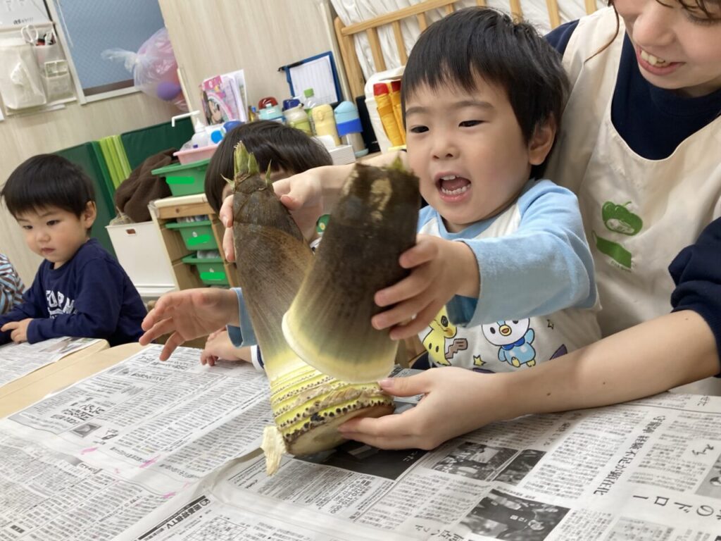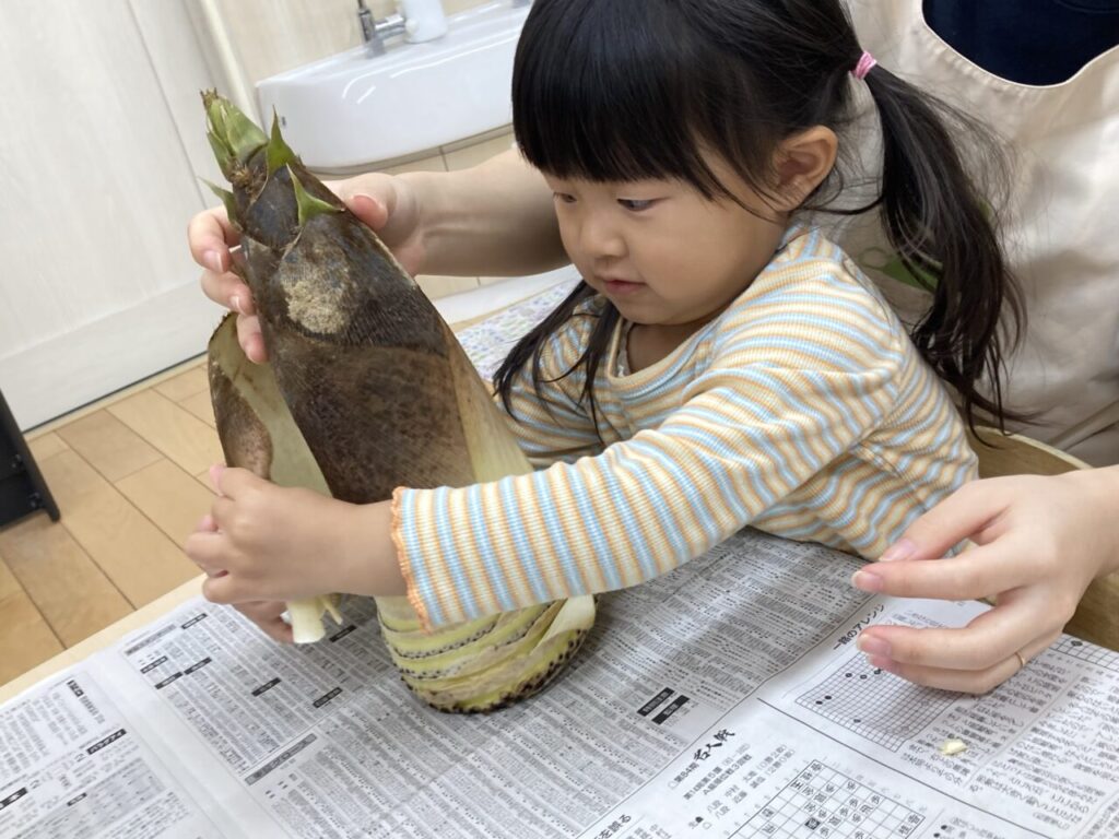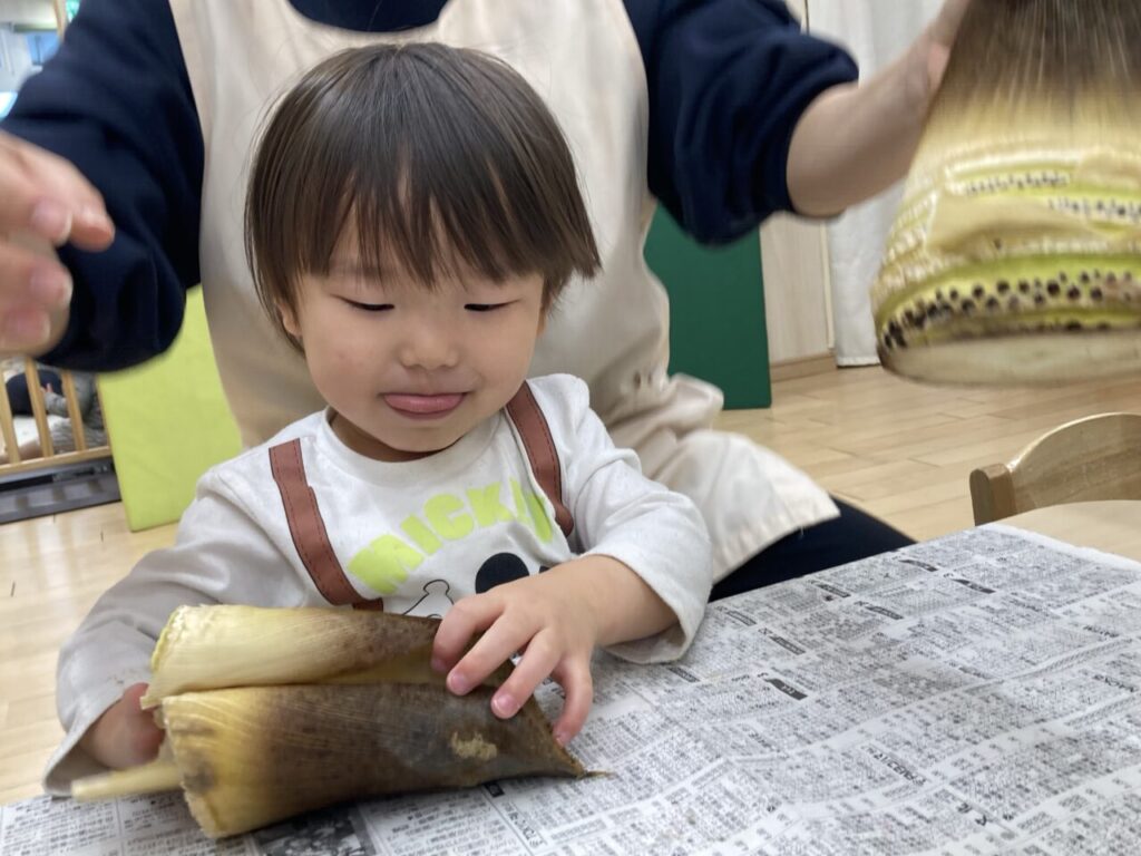 今月の食育、テーマは『たけのこ』。実際に触って、剥いて、食べて、たけのこの感触を確かめました😆