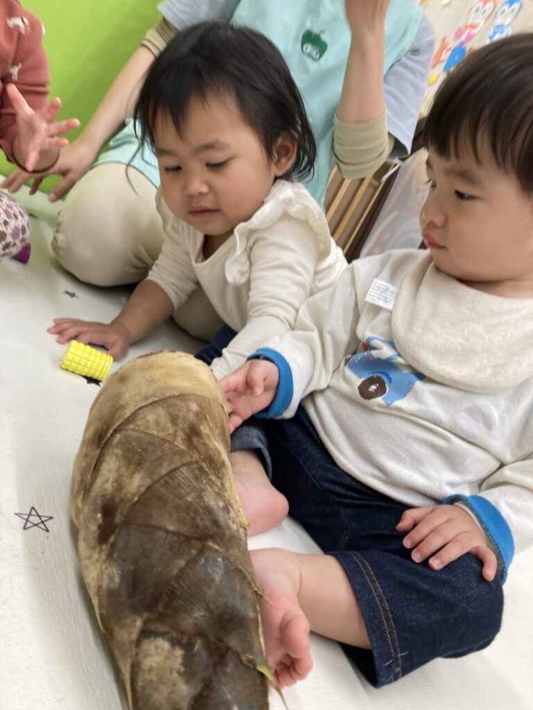 たけのこの皮を剥がしても剥がしてもまだまだついているのを面白がる2歳児のぶどう組のお友だち。