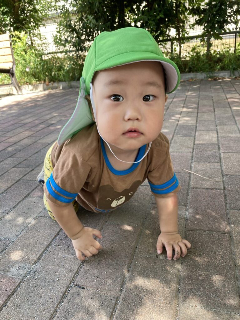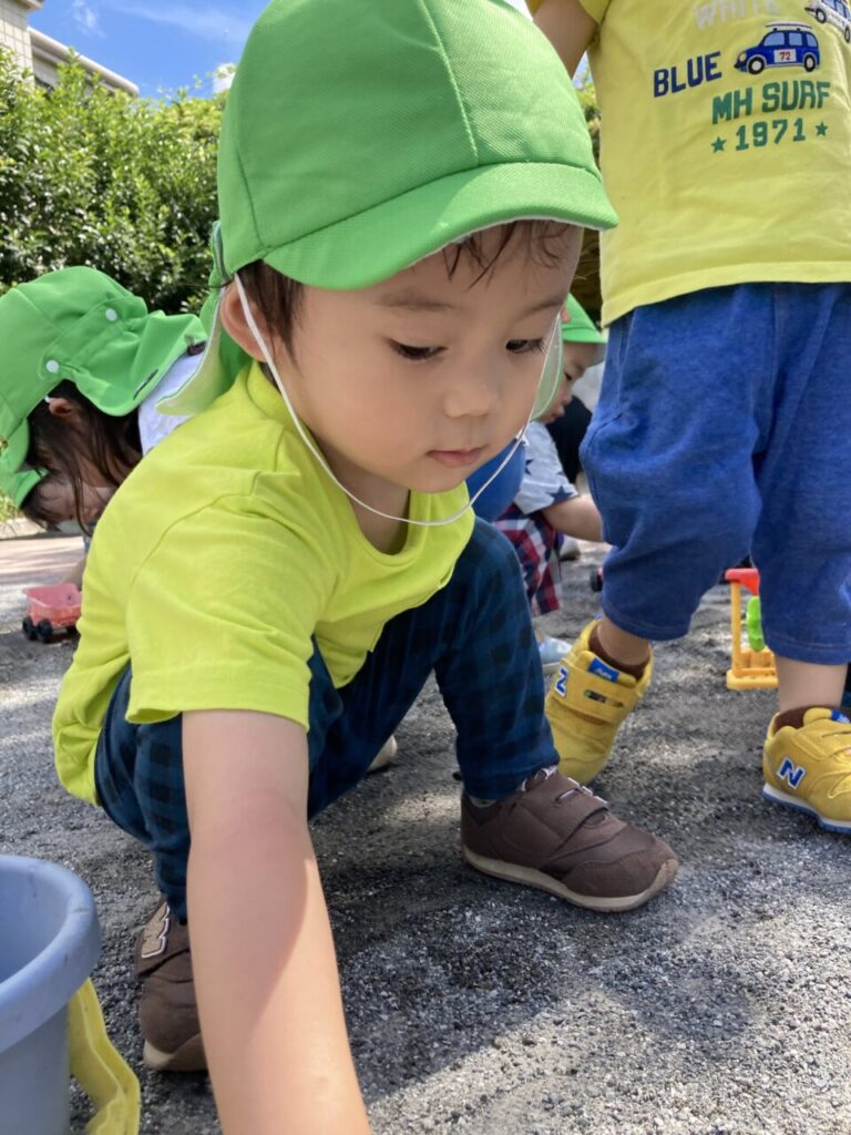 0歳児れもん組のお友だちもバギーから下りて、公園内の興味の向いたところへハイハイでのびのびと動き回っていました😊