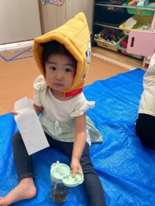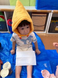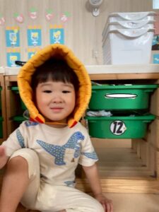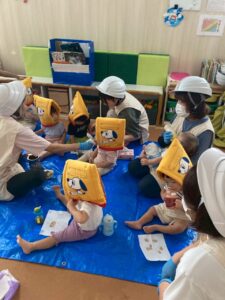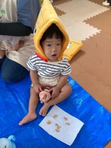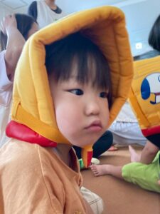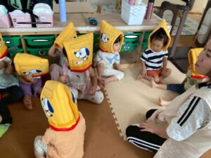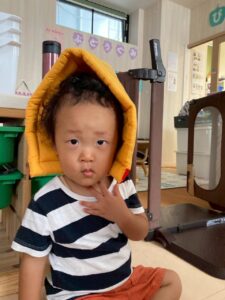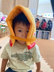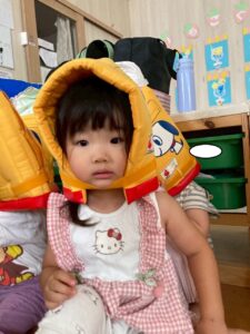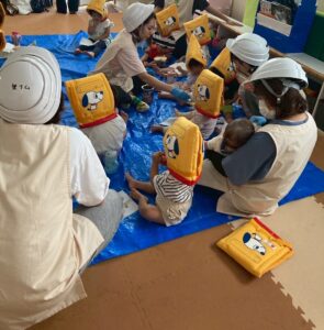 午睡中に地震が発生したと想定し、防災頭巾を被って先生の指示を待ちます✨