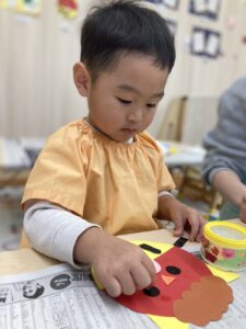 手に糊を付けて目やお口をペタペタ…🤭🌟
