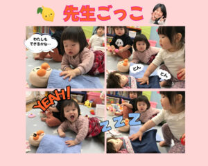 先生やママの真似をして寝かしつけをしている女の子を見て、