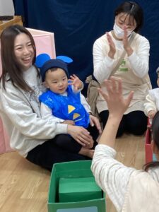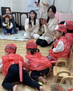 お歌や手遊びに合わせて、手を叩いたり、ひらひらさせたり、リズムに合わせて楽しんでいました🎵