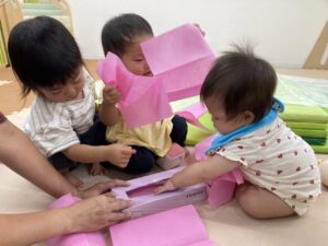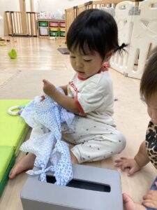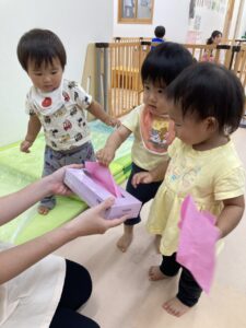 先生が作ってくれたティッシュのおもちゃ🎶
