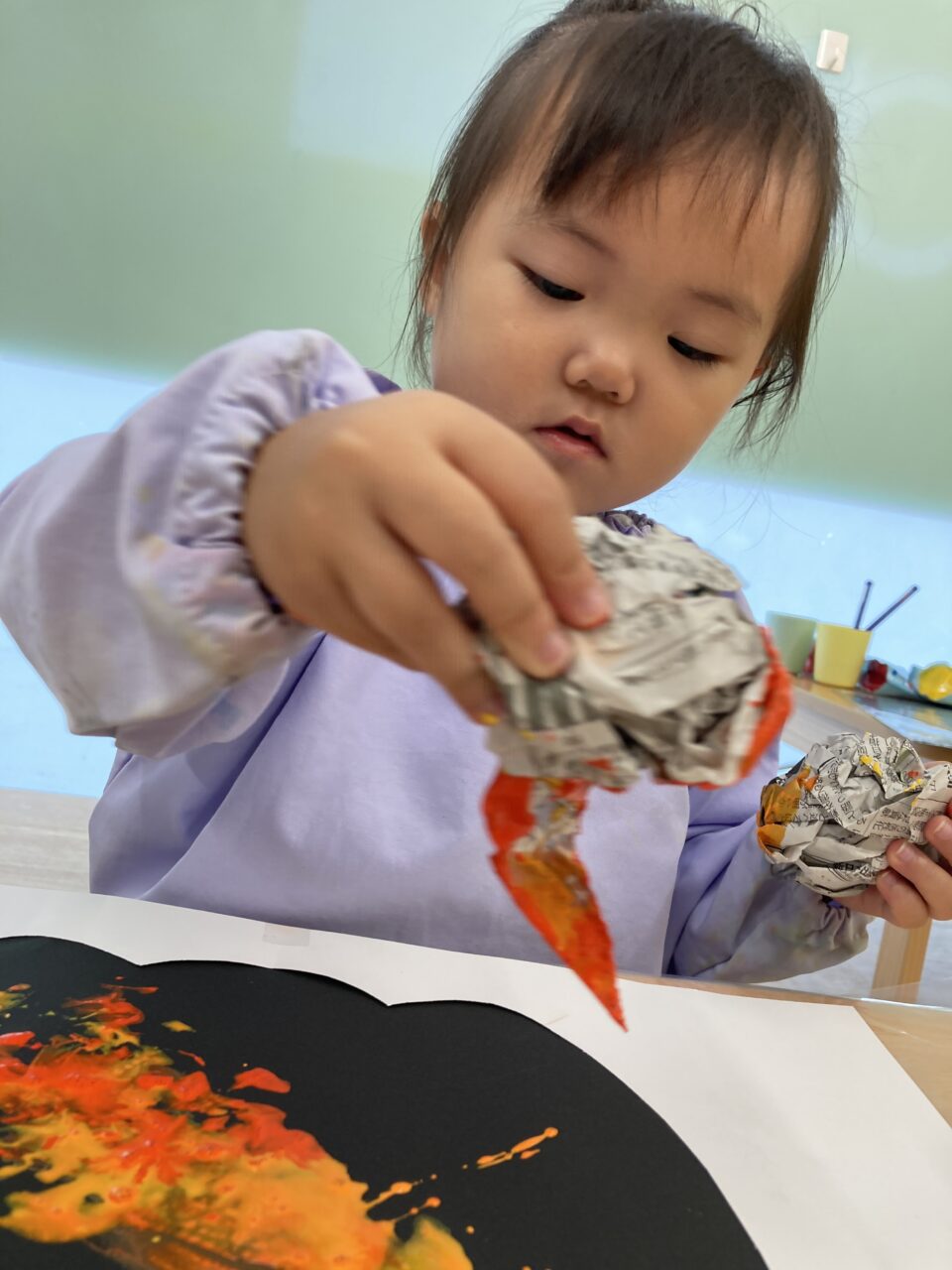 くしゃくしゃにした新聞紙に絵の具をつけて、黒い画用紙にぽんぽんと押しつけながら色をつけました🎨