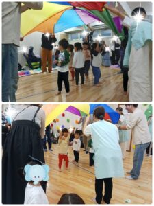 その後は、ママやパパがパラバルーンを持ち上げてくれて、その中にみんなで入りました!とっても楽しそうなみんなの笑顔が眩しかったです🤩