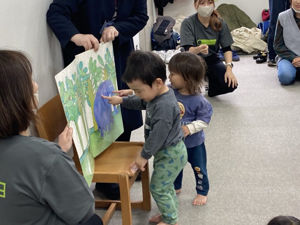 図書館の方によるわらべうた・絵本の読み聞かせを楽しみ、みんなで楽しい時間を過ごすことができました😆