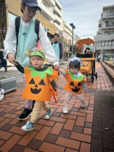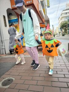 先生渾身の衣装を着て、近隣のお店にご協力をいただき可愛いモンスター❓達が訪問させていただきました🎃