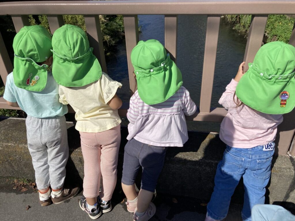川で寄り道中…何もいない川をじーーーっと観察中。子どもたちなりにいつもとは違う変化を探そうとしているのかもしれません。なかなか公園までたどりつけません。