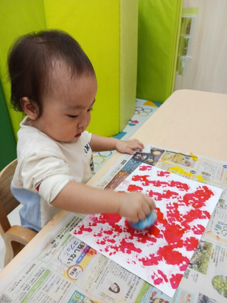0歳児、れもん組さんもしっかり椅子に座って、たんぽで画用紙に絵の具をぽんぽん!!