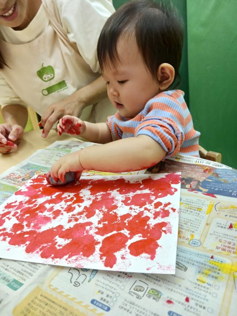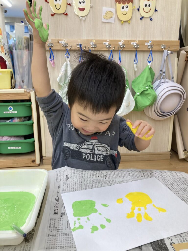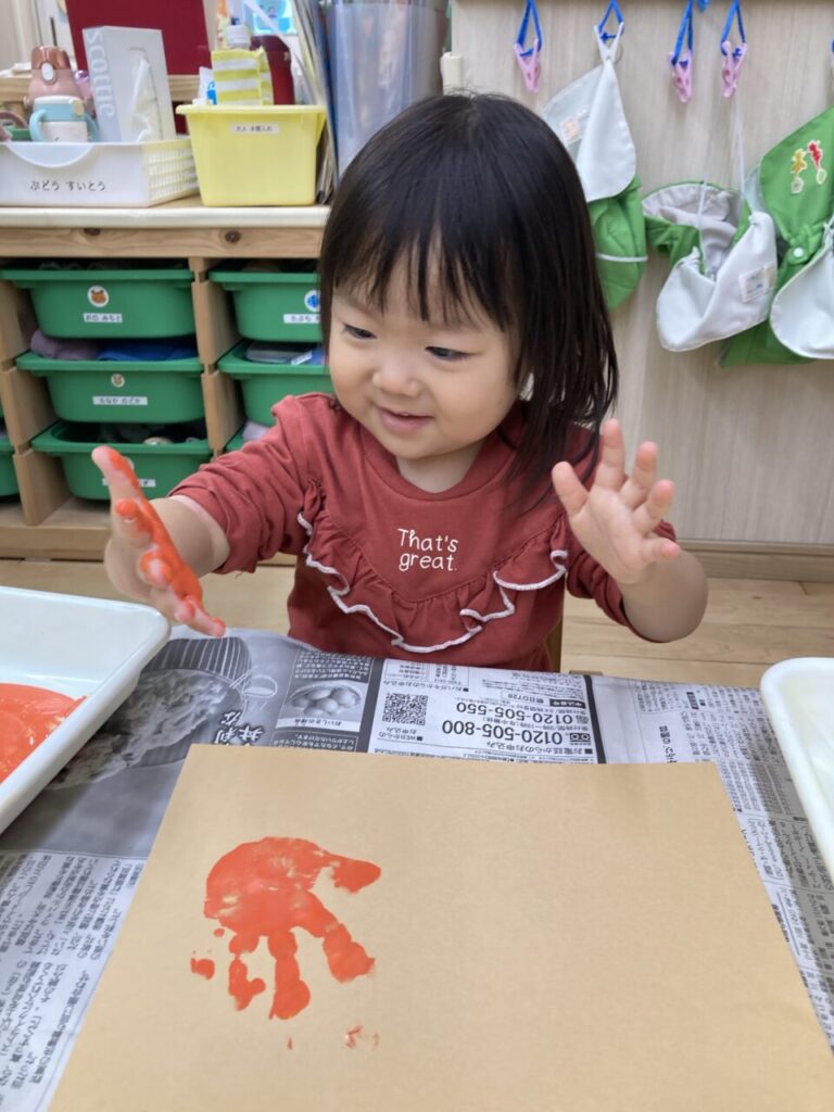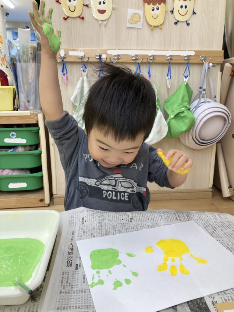 1歳児、いちご組さんは好きな色の絵の具を2色選び、画用紙に手形をぺったん!