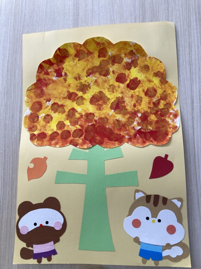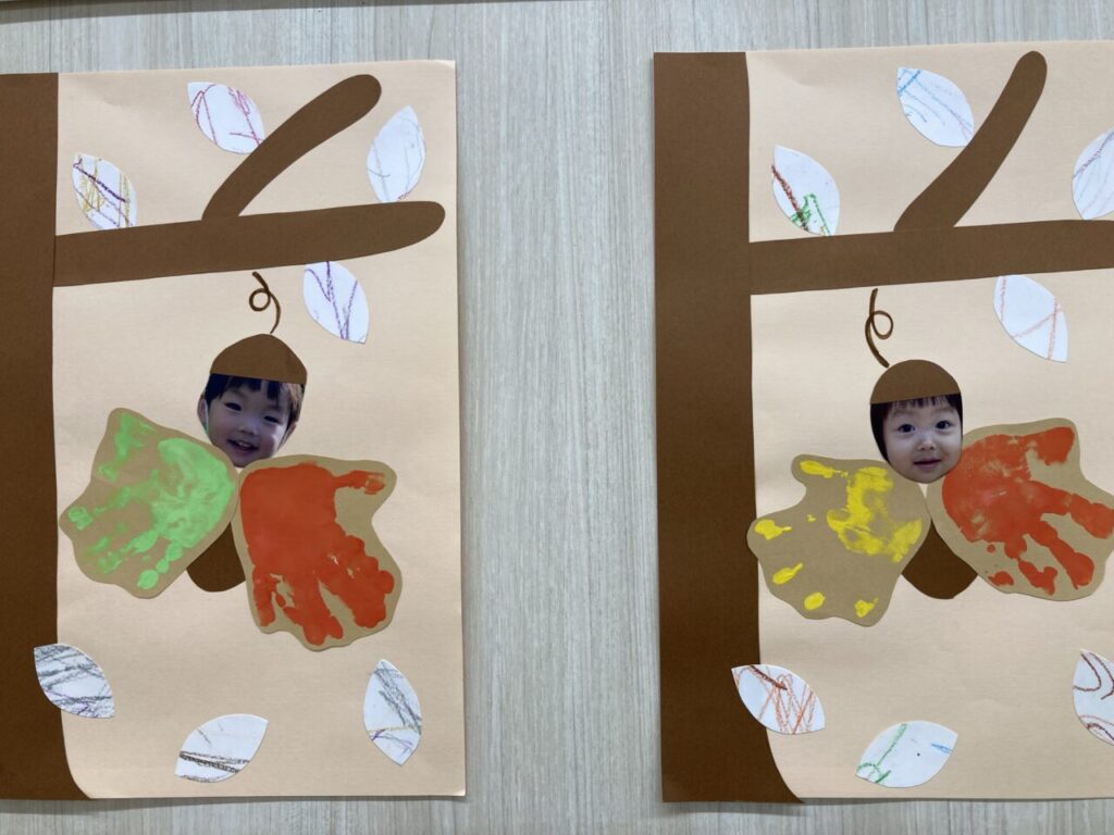 お散歩に出るとどんぐりやきれいに色づいた落ち葉等、『秋探し』を楽しんでいます。11月制作では、保育室内を素敵な秋でいっぱいにしてくれましたよ🌈