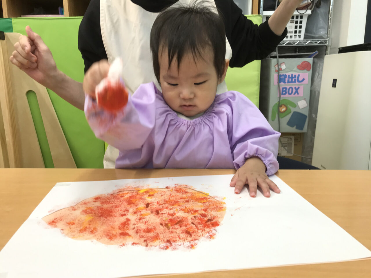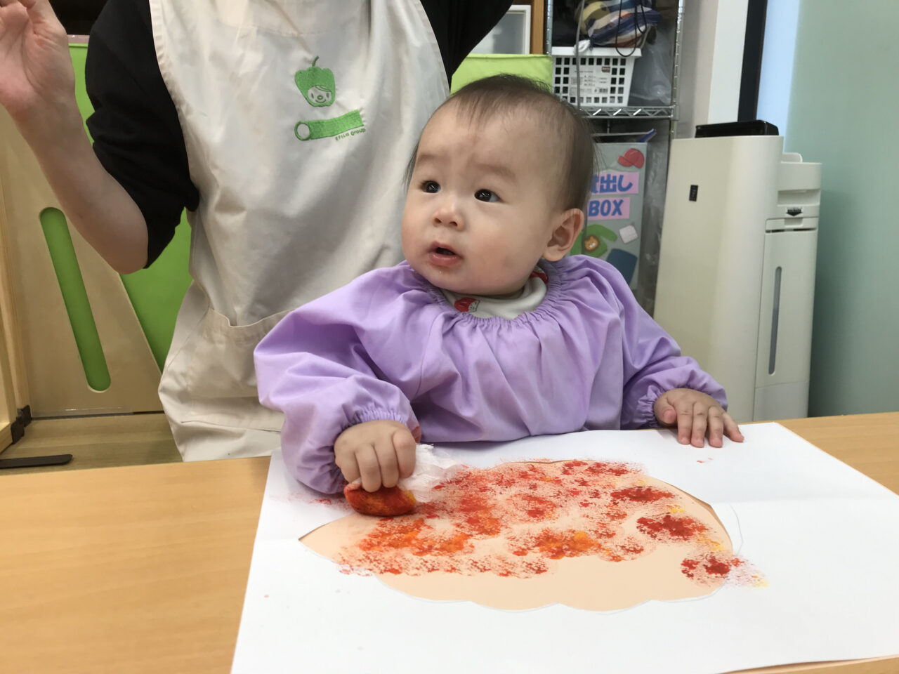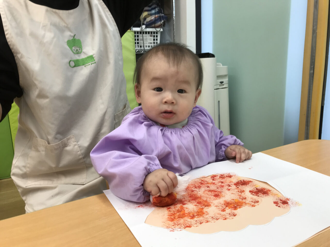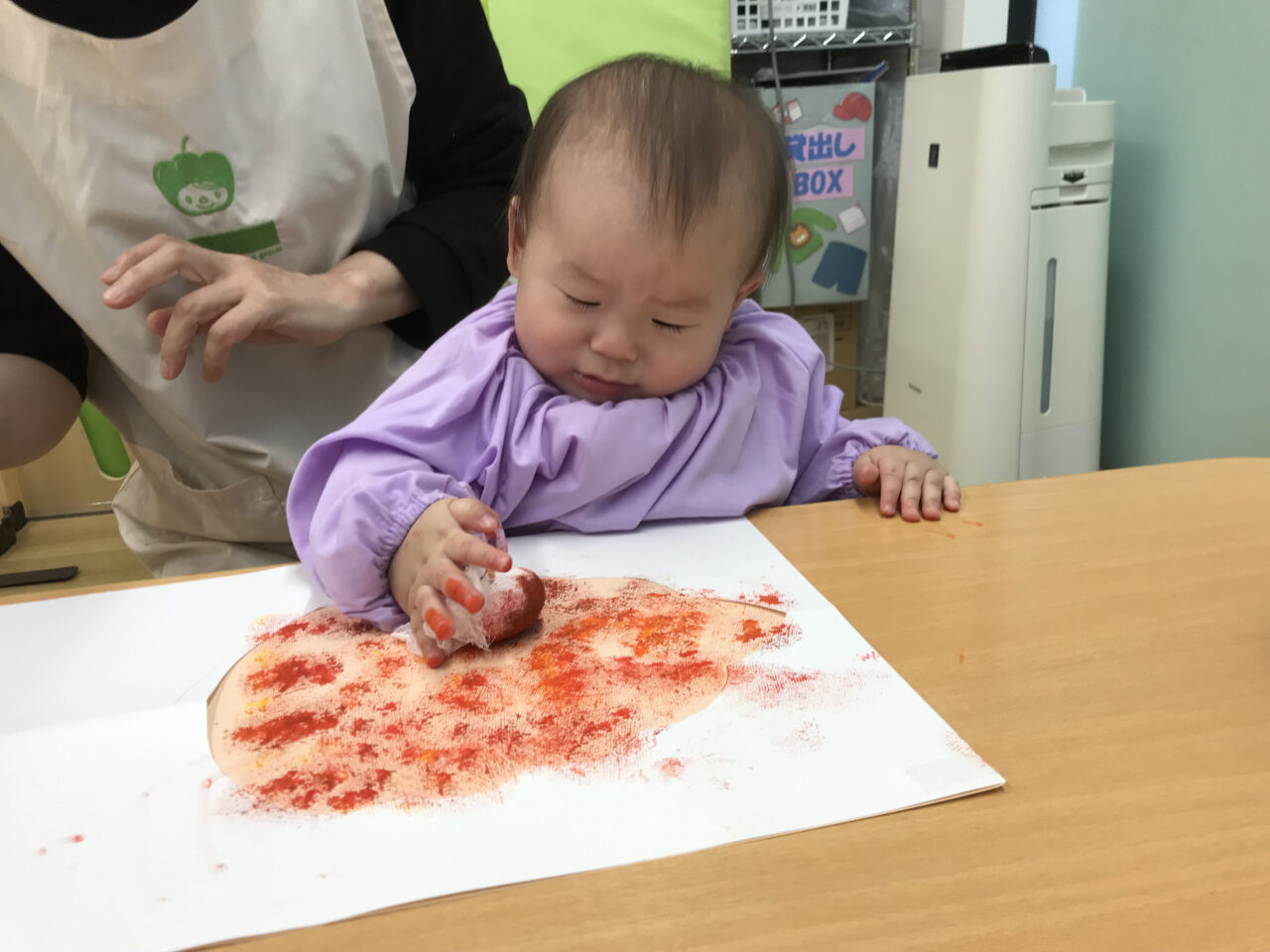 0歳児クラスでは、赤やオレンジの絵の具を使って“秋の色あそび”を楽しみました✨