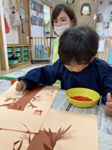 赤やオレンジの絵の具にスポンジを付けて、ペッタン♪
