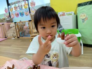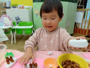公園で拾ったドングリと粘土を使って遊びました。型を取った粘土にドングリを飾り付けするとケーキが出来上がりました🎵