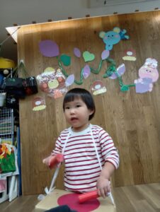 手作りの太鼓を使って「おおきなたいこ どーんどん!!」とお歌に合わせて太鼓を叩きました🎵