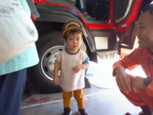 その後、少し緊張している子どもたちでしたが消防士さんのお話を聞いてから本日の一大イベント!!