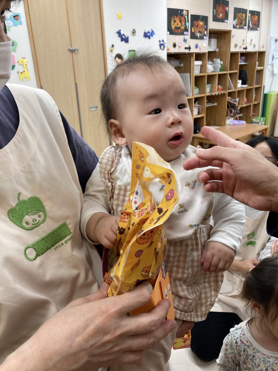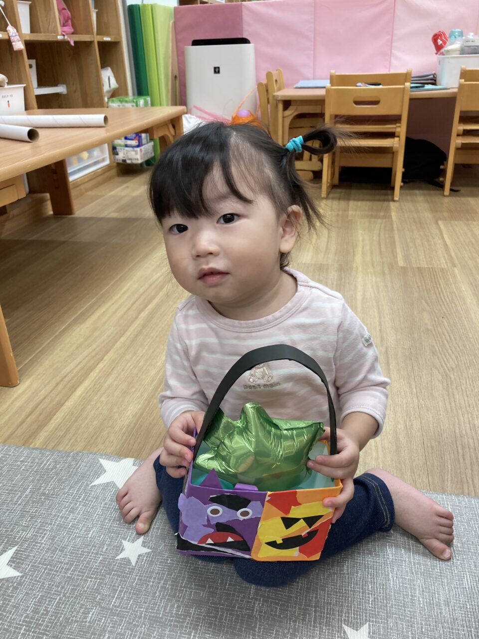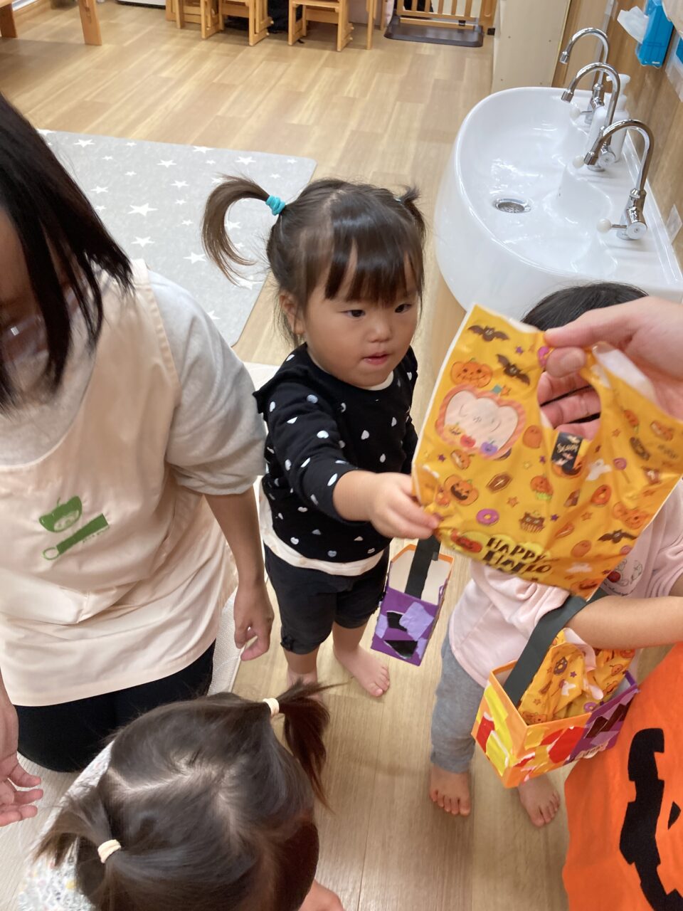 かわいいハロウィンバッグを手に、お菓子を受け取り笑顔があふれました🥰
