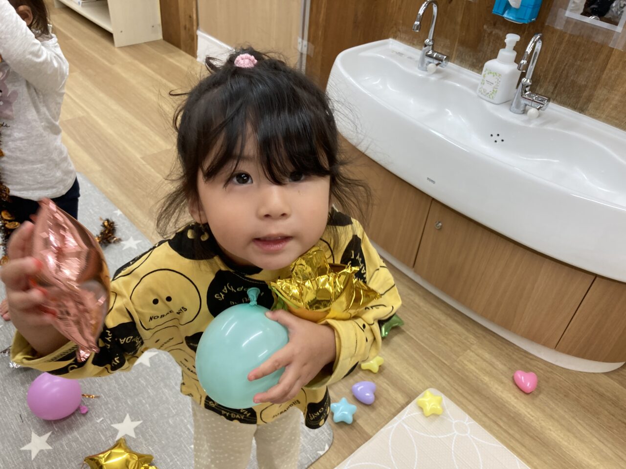 順番にピニャータをたたき、ぱかっと割れると中から風船や飾りが飛び出し、大喜びの子どもたちでした👏