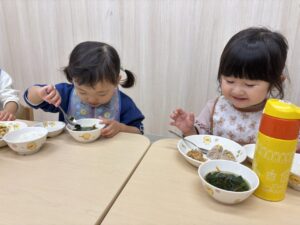 ぶどうぐみ(2歳児)さんは、みんなで美味しいね~と言い合っていつも楽しそうに食べています🎵