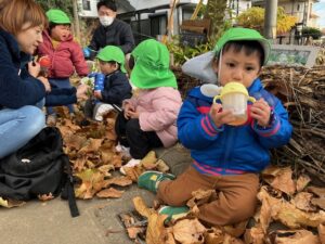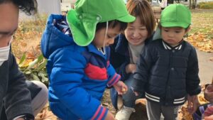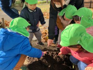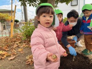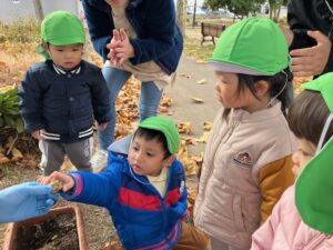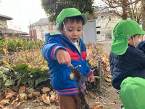 最初はなんだろう~🧐と不思議そうで動けなかったいちご(1歳児)さん🍓でしたが、試しに一つ先生が掘ってみました🥔