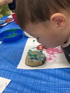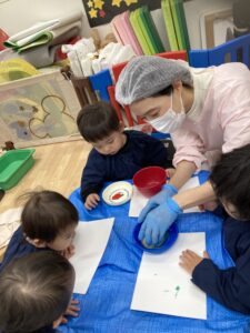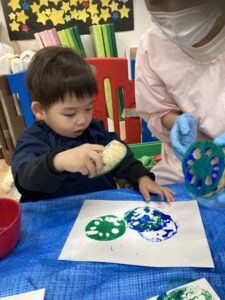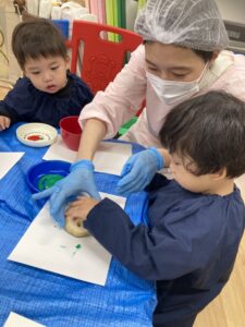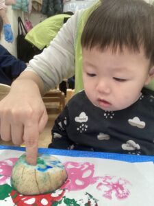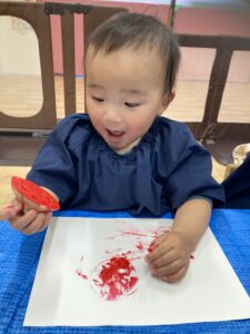 みんなで絵の具に付けて画用紙にペッタン!と、野菜スタンプにして遊んでみました🤓
