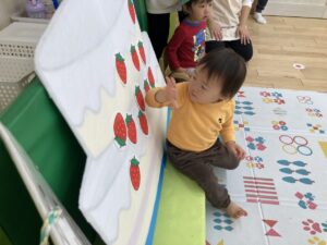 みんなでひとつずついちごを飾りましょう☺️ってことで、順番に貼り付けていきます☝️