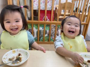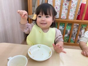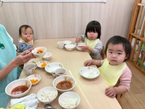 食欲旺盛な🥄れもん組(0才児)🍋さん、お皿に手を伸ばし