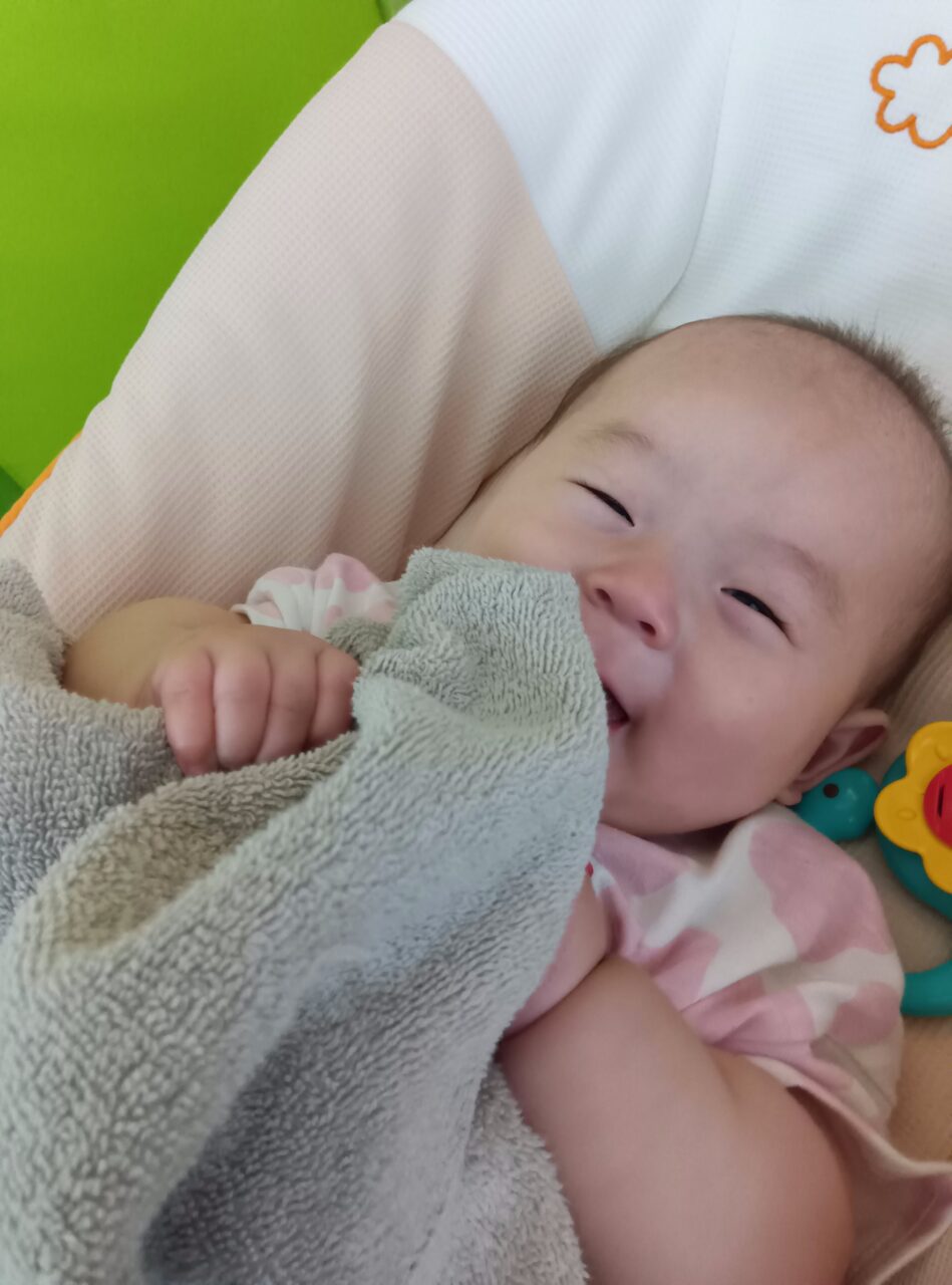 寝返りやつかまり立ち、ハイハイと身体を使った遊びも増え、今では歩けるように✨