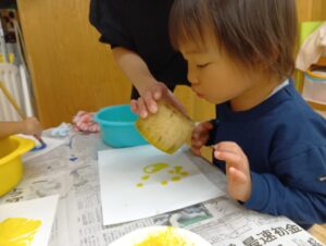 と考えてみると💡「シャボン玉」にしよう!!とシャボン液と絵具をつけて製作をしました。