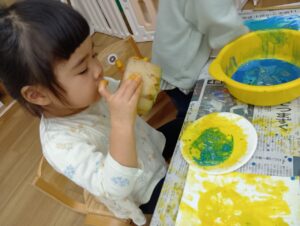 シャボンが割れてきれいな丸い色がつききれいな製作ができました💛