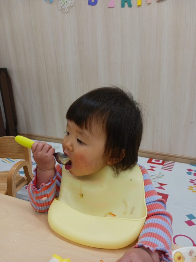 11時。みんな大好きな給食の時間です。お子様毎に月齢にあった離乳食メニューを提供しています😋