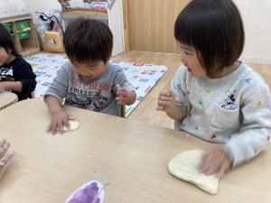 思い思いにこねたりちぎったりつなげたり、ピザ屋さんになったり!