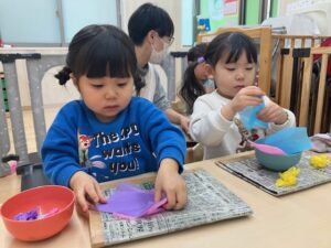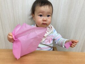 れもん組(0歳児)さんは花紙をクシャクシャして素敵な鬼の帽子を作りました👹✨
